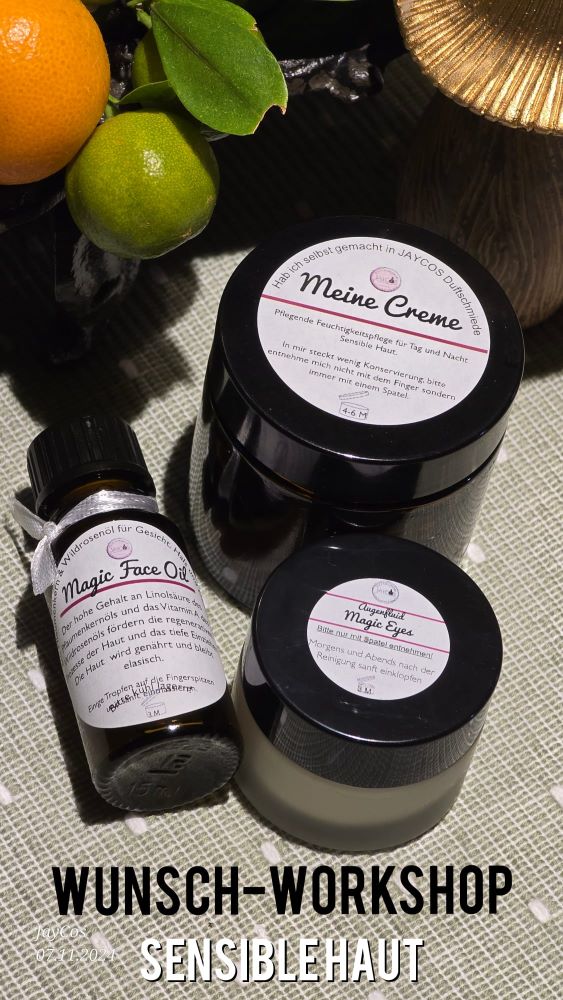 In diesem Wunsch-Workshop haben wir eine nährende Hautpflegeserie mit besonders milden, hautfreundlichen Rohstoffen zusammengestellt, die genau auf die Bedürfnisse der Haut und der persönlichen Vorlieben der Teilnehmerinnen abgestimmt ist.