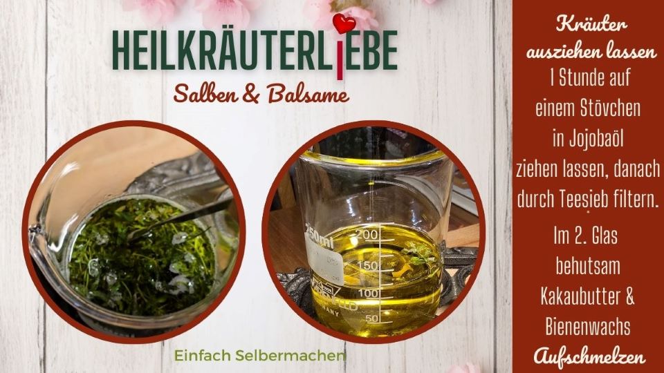 3. Danach die Kräuter durch ein Teesieb filtern und in das Öl mit dem flüssigen Bienenwachs und der Kakaobutter geben und vom Feuer nehmen. Evtl. nochmal klar aufschmelzen